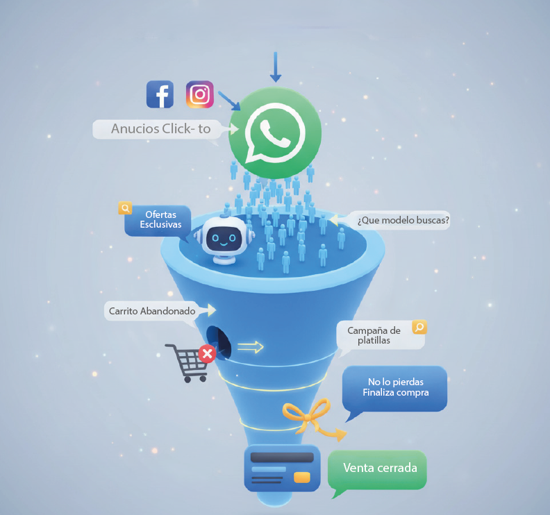Anuncios Click-to-WhatsApp: Configura tus campañas de Facebook e Instagram no para llevar a una landing page (donde el cliente se enfría), sino para abrir una conversación de WhatsApp. (Flujo: Anuncio -> Chatbot calificador -> Agente humano para cerrar).