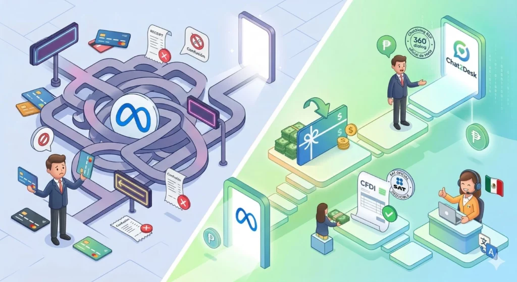 Al gestionar el pago directamente con Meta, te enfrentas a procesos complejos: requieres una tarjeta de crédito o débito internacional , los cobros son aleatorios y, lo más importante, el recibo emitido no es deducible en México.