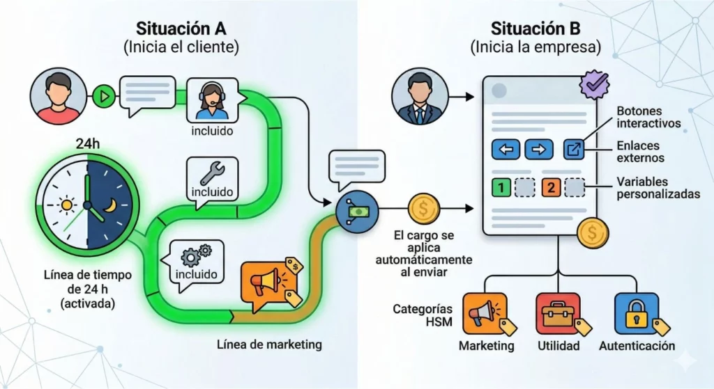 Es importante aclarar que el costo de la API no se basa en una renta mensual fija, sino en un modelo de pago por uso real. Meta estructura sus cobros a través de los llamados “Mensajes de Inicialización” o HSM (Highly Structured Messages).