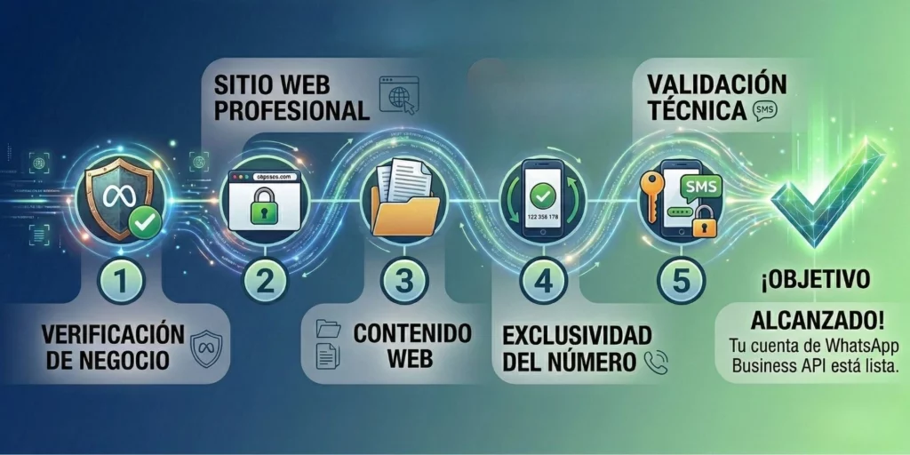 Para implementar Whatsapp Business API, es indispensable que tu empresa atraviese un proceso de validación oficial administrado a través del Meta Business Manager. A continuación, detallamos los pilares necesarios: