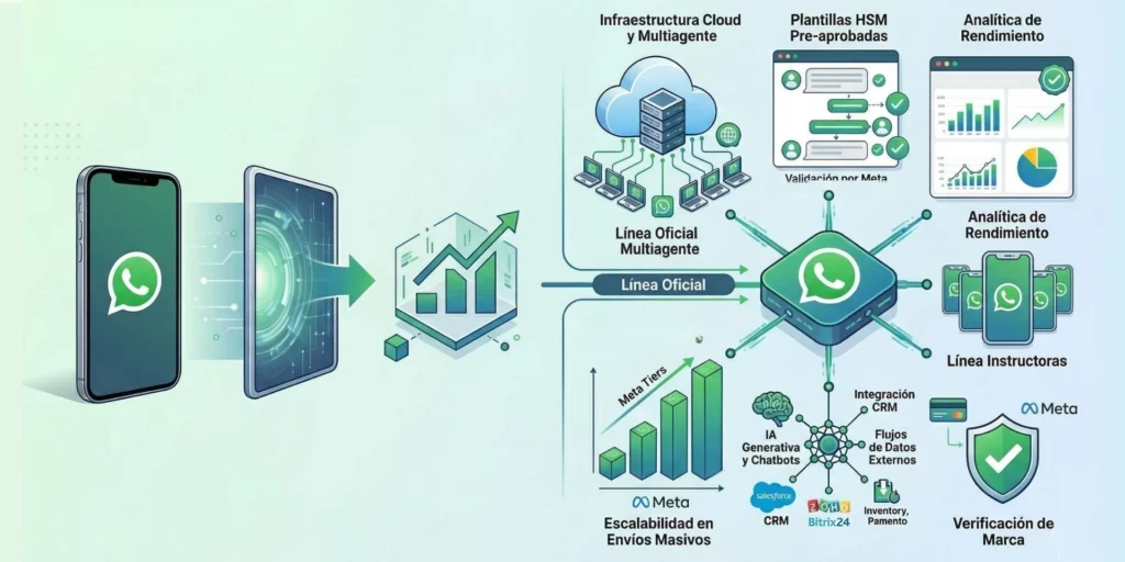 A diferencia de las versiones locales, la cuenta whatsapp business API opera en la nube. Esto elimina la dependencia de un dispositivo móvil físico encendido o conectado a internet. Permite una arquitectura de respuesta masiva donde cientos de agentes pueden intervenir simultáneamente sobre una misma línea oficial, sin conflictos de sesión y con una disponibilidad del 99.9%.